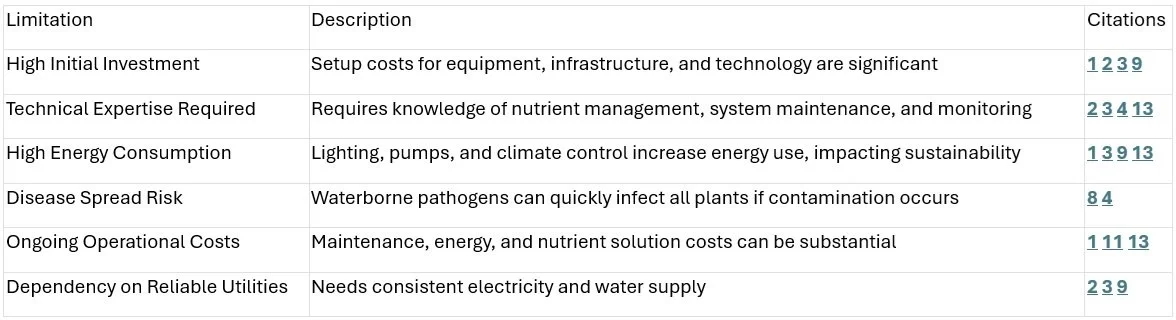 Hydroponic agriculture offers major benefits in water and land efficiency, yield, and sustainability, especially for urban and resource-limited settings. However, high costs, technical complexity, and energy demands remain significant barriers to widespread adoption. Careful planning and technological advances are key to maximizing its potential.